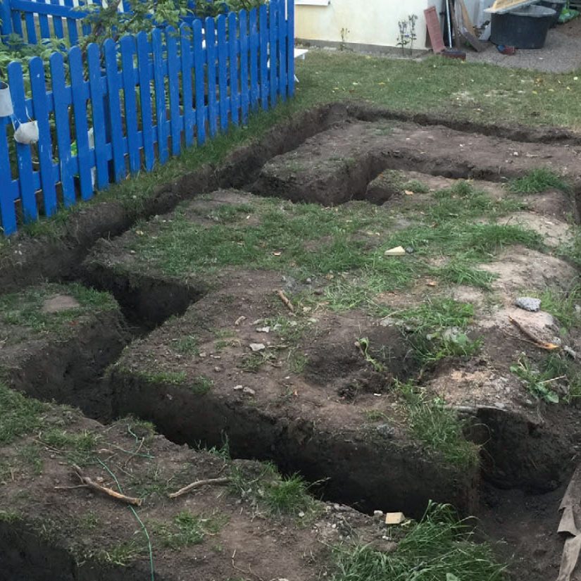 Lag en ringmur. Vi har først gravd ut der orangeriet skal stå, og fylt opp med pukk som et kapillærbrytende bærelag.
