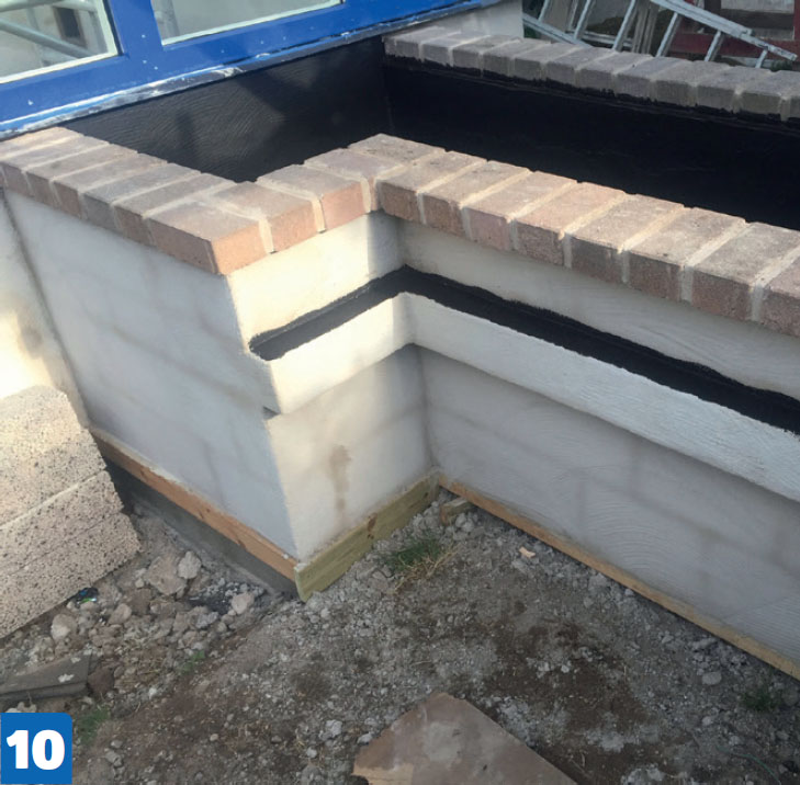 Toppen av bedet avsluttes med murstein, som både ser bra ut og beskytter lecablokkene.