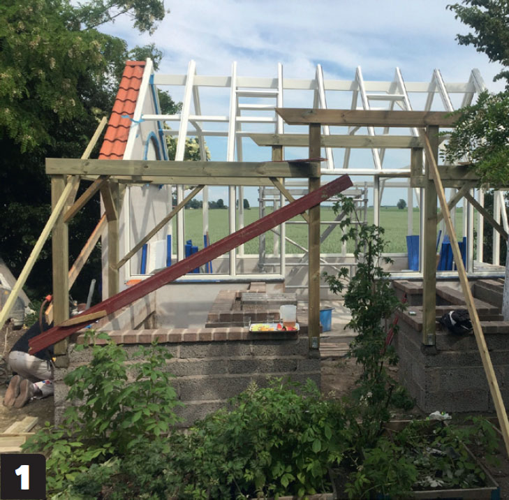 For å styrke konstruksjonen ytterligere, kan du legge to toppsviller à 48 x 98 mm oppå hverandre som her, eller eventuelt bruke 98 x 98 mm i stedet. Stenderne og svillene skrus sammen fra toppen og bunnen. Da unngår du beslag inne i rammene, der termorutene skal monteres.