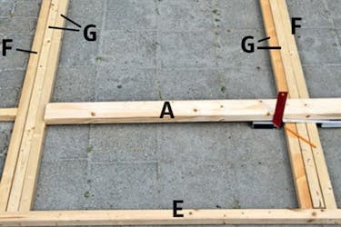 Kapp rammestykkene (M). Avstanden mellom de loddrette stolpene (F) er 61 cm, så det samme er lengden på rammedelene (M). Med dem på plass gir plasseringen av de vannrette rammedelene (E og J) seg selv.
