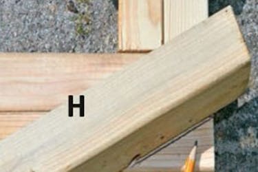 Kapp til de skrå sprossene (K). De skal sitte inn mot det loddrette stykket (L) og tilpasses i den andre enden opp mot de skrå sperredelene (H) og skrus fast.