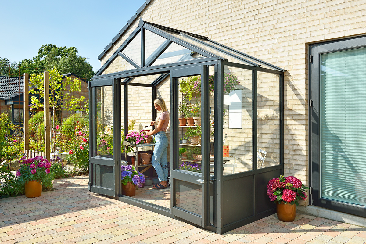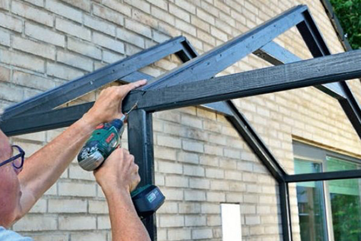 Rammene skrus helt enkelt sammen gjennom de loddrette delene. Siderammene ligger utenpå front rammen. Siderammenes bakerste stolpe og den bakerste takstolen skrus fast til husveggen. Glasset settes fast med falslister i plast (du kan også bruke trelister).