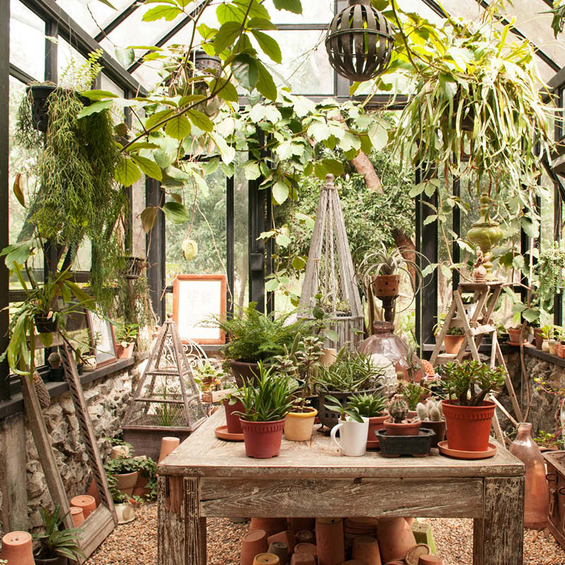 Hvis du vil ha planter i mindre potter, kan du utnytte plassen ved å sette opp hyller. Det ser fint og frodig ut med planter i ulike nivåer.