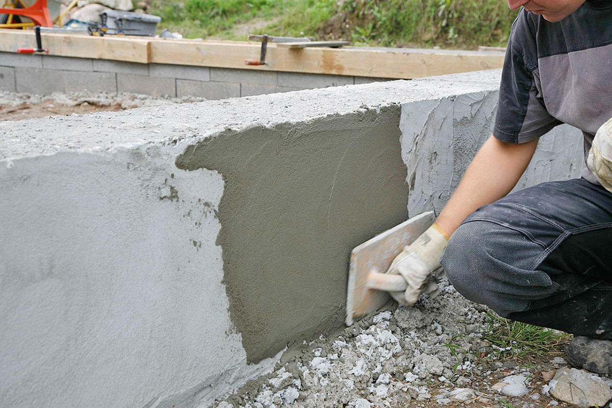 Dagen etter fjernes bordene, og etter ei ukes tid, avhengig av vind og vær, kan du mure oppå. Som det ses, er unøyaktighetene i høyden bare jevnet ved å variere tykkelsen på betonglaget. Det skjules senere av et lag med sokkelpuss.