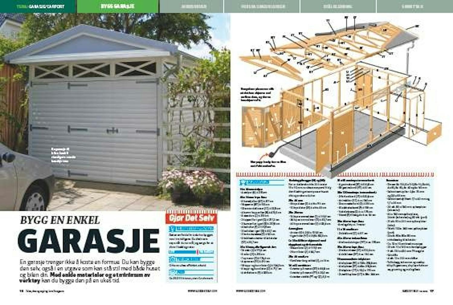 Garasjen er bygget rundt tre rammer, oppå et eksisterende fundament. Vi har to langvegger og en bakvegg. Alle er bygget etter samme prinsipp, så her viser vi bare hvordan du lager den ene langsiden. Målene kan tilpasses, slik at de matcher størrelsen på bilen din eller andre behov du har. Prinsippet for byggingen er uansett det samme.