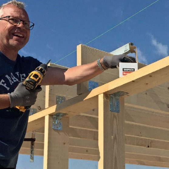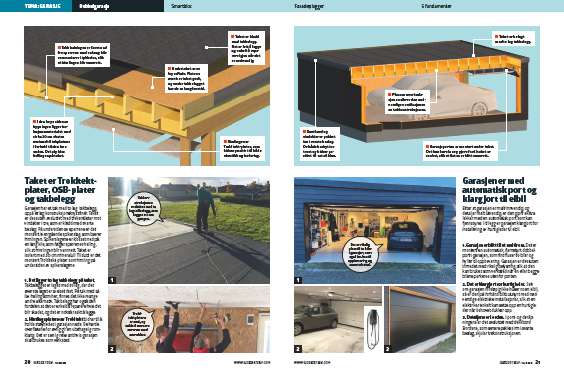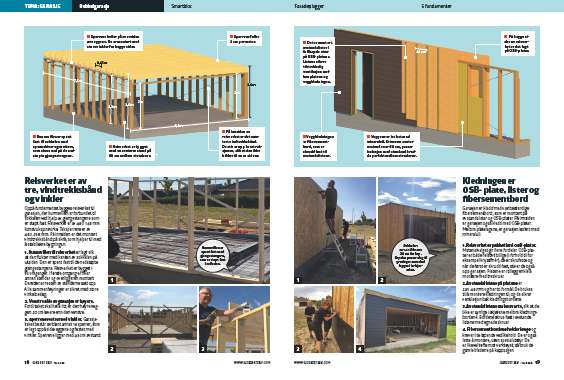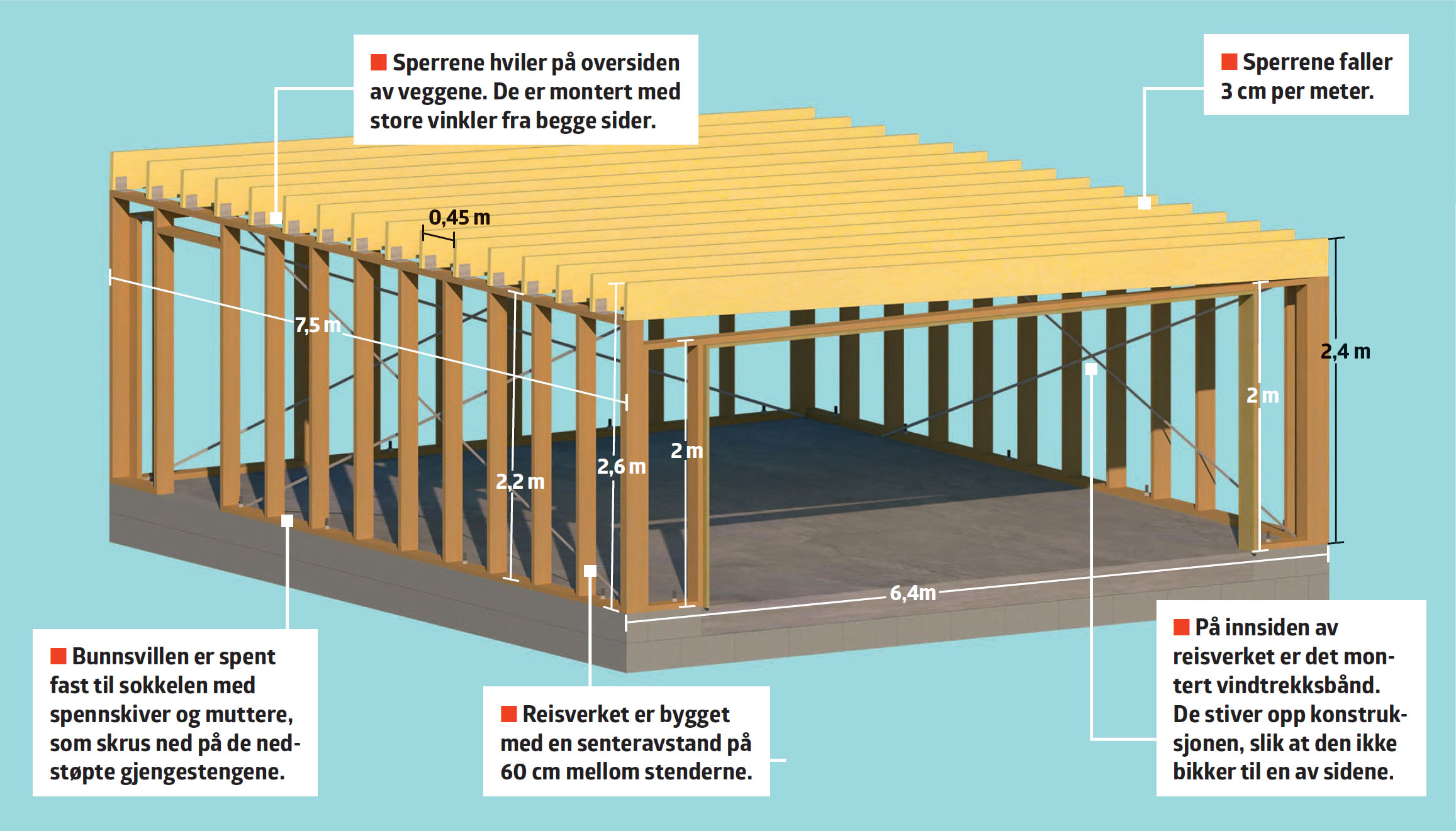 Oppå fundamentet bygges reisverket til garasjen, der bunnsvillen er forbundet til sokkelen ved hjelp av gjengestengene som er støpt fast. Reisverket er av 48 x 148 mm konstruksjonsvirke. Taksperrene er av 48 x 298 mm. På innsiden er det montert vindtrekksbånd på skrå, som hjelper til med å stabilisere bygningen.