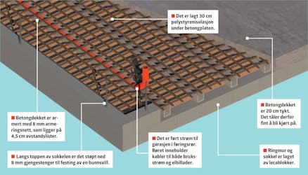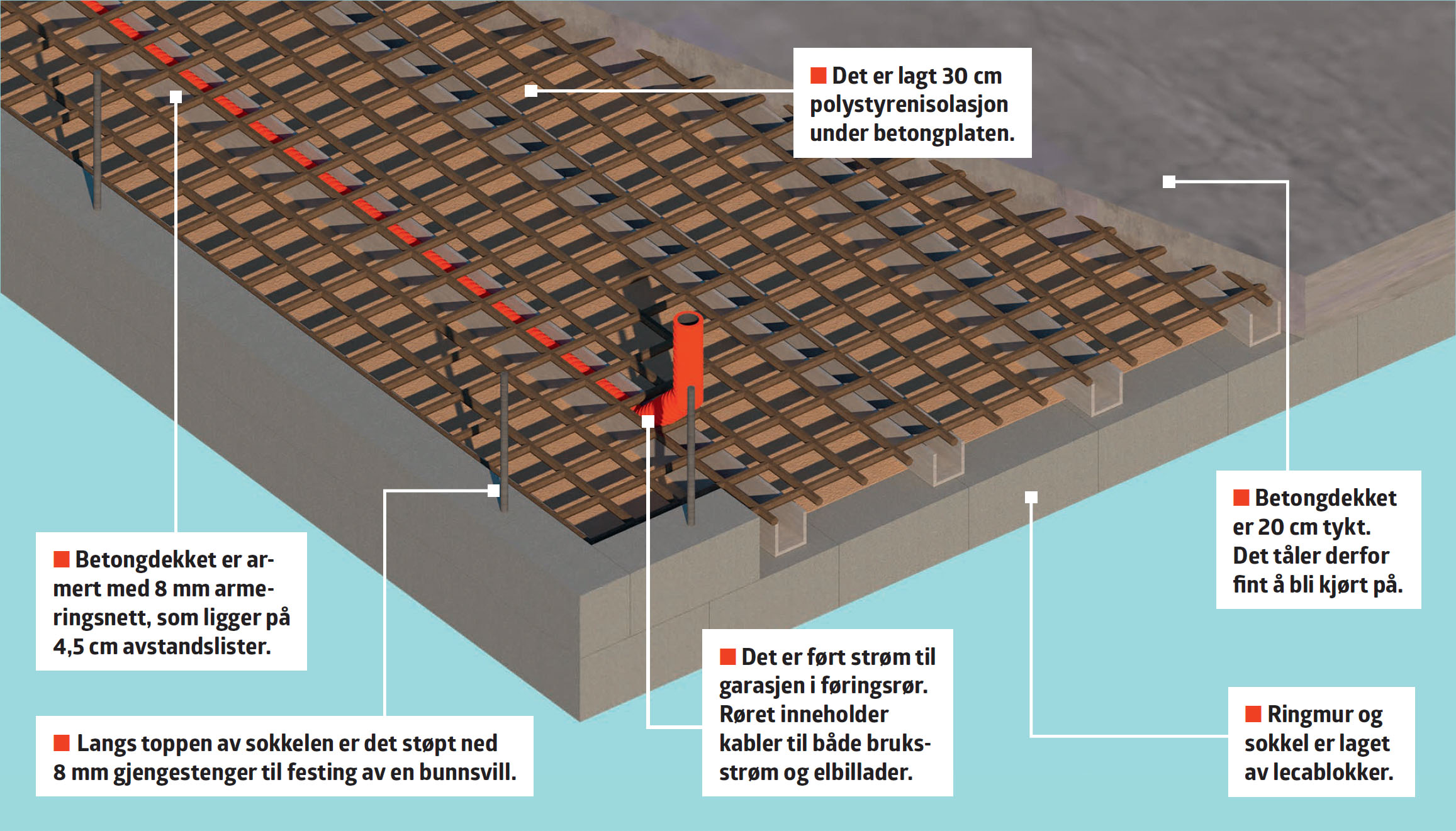 Garasjen er bygget på en isolert plate på mark, av 30 cm isolasjonsmateriale og 20 cm betong. Dekket er støpt innenfor en sokkel av lecablokker, som ligger i tre skift. Langs sokkelen på oversiden er det støpt ned gjengestenger til senere bruk.