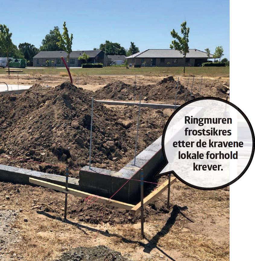 Garasjen hviler på en ringmur, som er laget av betong og lecastein. Ringmuren er frostsikret etter lokale forhold, og det er støpt ned 16 stykker 8 mm gjengestenger, som skal brukes til å montere fast bunnsvillen i reisverket til sokkelen.