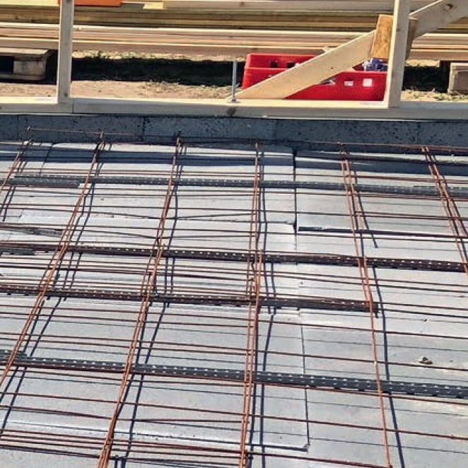 Det er isolert med 30 cm polystyren innenfor ringmuren, og det er lagt ned tomrør til føring av strømkabler. Oppå isolasjonen er det forberedt til støping av betongplaten med et lag 8 mm armeringsnett, som ligger på 4,5 cm avstandslister.