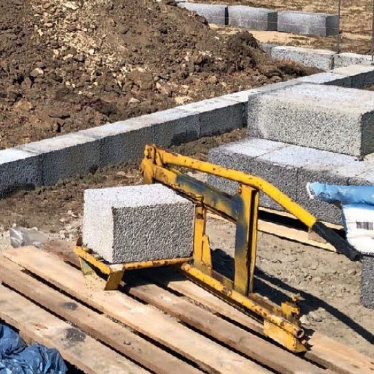Sokkelen består av ytterligere to skift lecastein. Steinene er murt opp i forband, og der det er behov, kuttes steinene med en steinsaks.