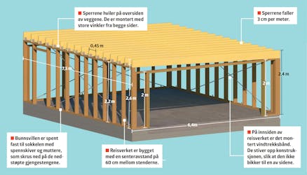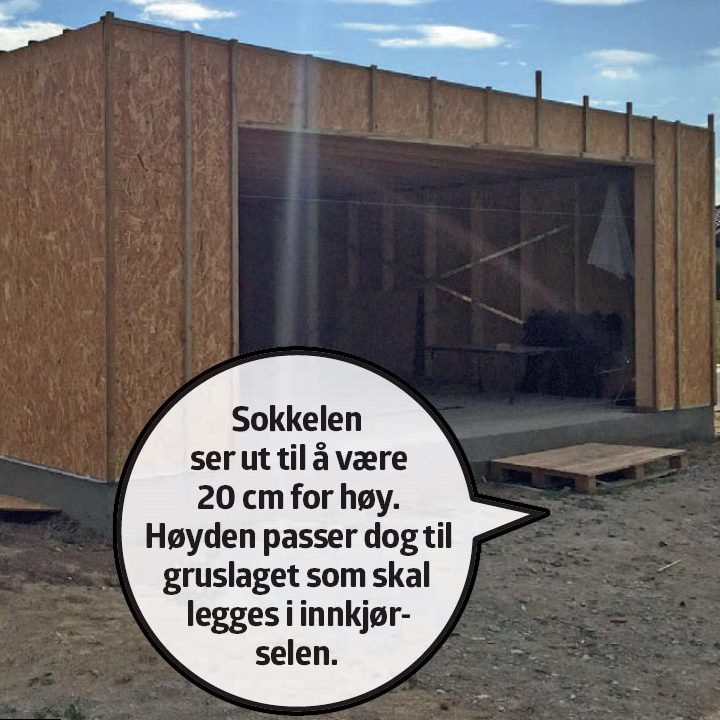 Venstre side av garasjen er høyere. Fordi taket skal helle litt, er den høyre veggen 20 cm lavere enn den venstre.