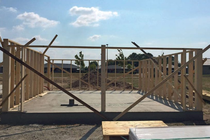 Bunnsvillen til reisverket er lagt slik at den flukter med kanten av sokkelen på utsiden. Den er spent fast til de nedstøpte gjengestengene. Reisverket er bygget i to omganger. I første omgang er hver annen stender og overliggeren montert. Deretter er resten av stenderne satt opp. Alle sammenføyninger er sikret med store vinkelbeslag.