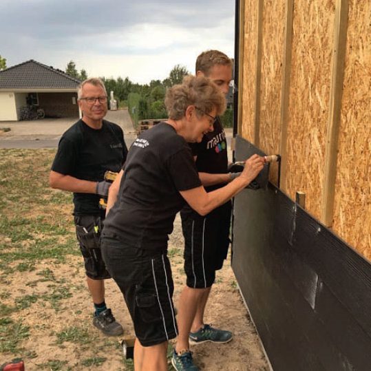 Avstandslistene males svarte, slik at de ikke er synlige i skjøtene mellom kledningsbordene. Bordene skrus fast i avstandslistene med egnede skruer.