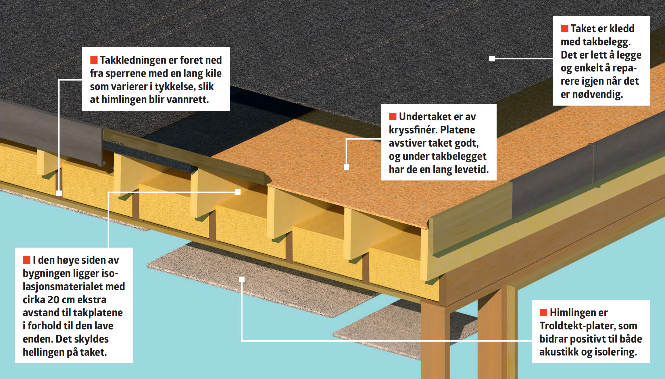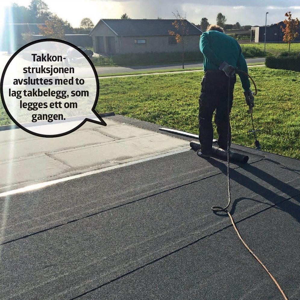 Det ligger to lag takbelegg på taket. Takbelegget er laget med to lag, der det øverste laget er sveiset fast. På tak med så lav helling som her, finnes det ikke mange andre alternativ. Takbelegg har også den fordelen at det er enkelt å reparere hvis det blir skadet, og det er nokså raskt å legge.
