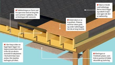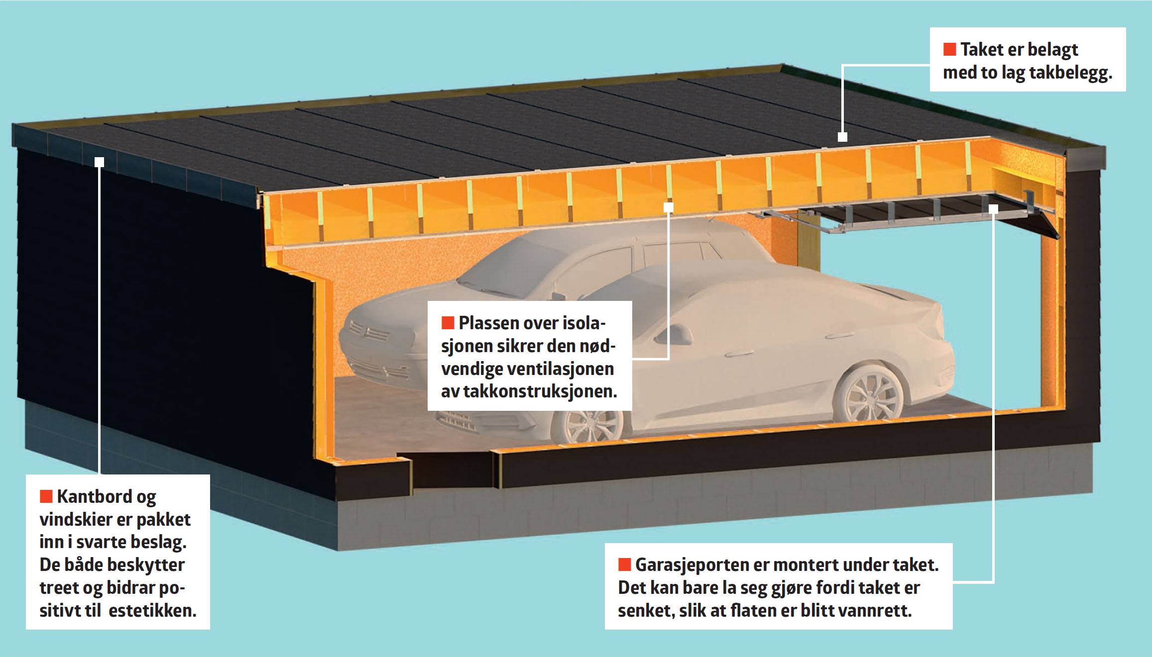 Garasjen har et tak med to lag takbelegg, oppå et lag konstruksjonskryssfinér. Taket er dessuten avsluttet med trekantlister mot vindskier i tre, som er kledd med svarte beslag. På undersiden av sperrene er det montert tverrgående spikerslag, som bærer himlingen. Spikerslagene er klosset ned på en lang kile, som følger sperrenes helling, slik at himlingen blir vannrett. Taket er isolert med 20 cm mineralull. Til slutt er det montert Troldtekt-plater som himling på undersiden av spikerslagene.
