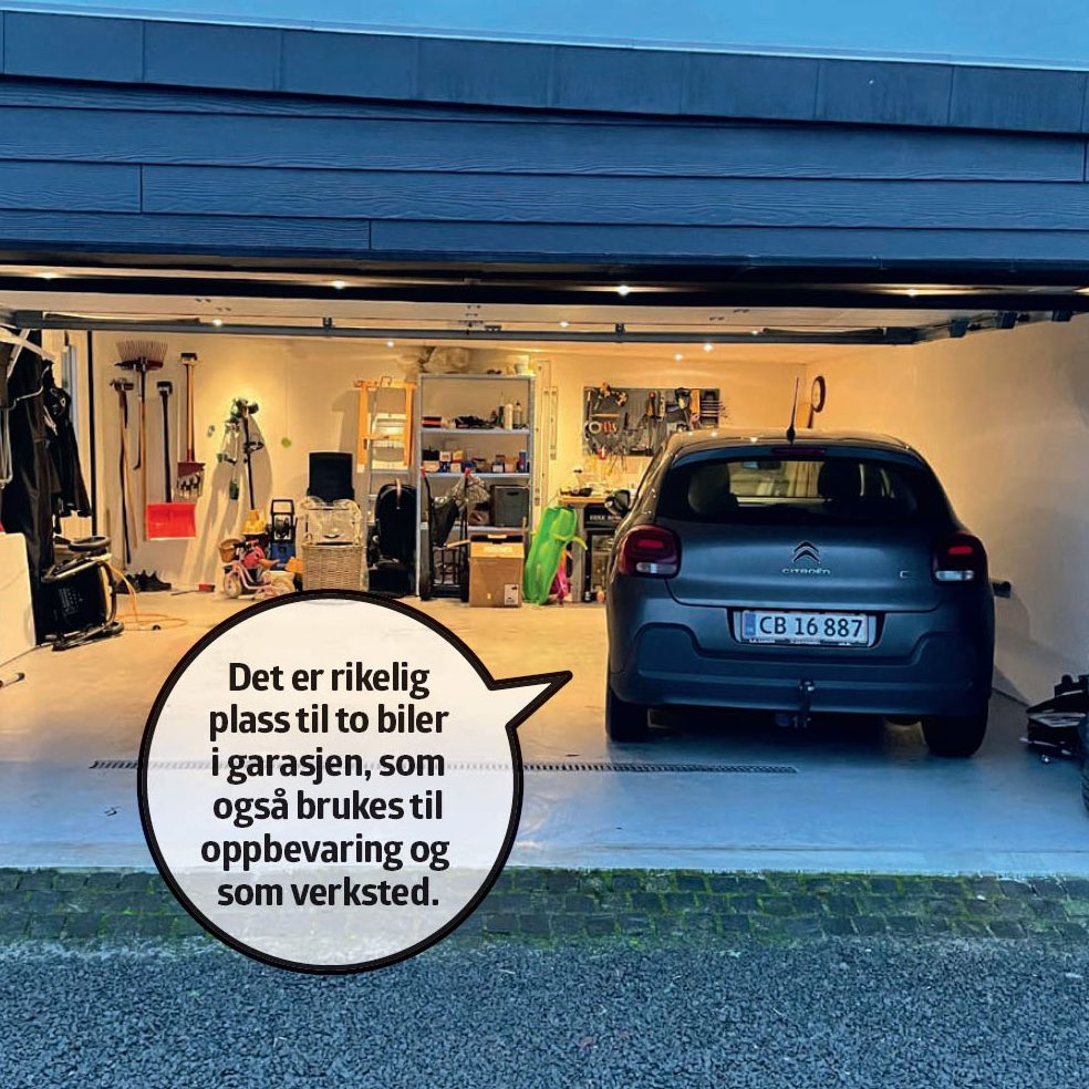 Garasjen er blitt til et multirom. Det er montert en automatisk, fjernstyrt dobbelport i garasjen, som fint huser to biler og hyller til oppbevaring. Garasjen er dessuten innredet med rikelig belysning, slik at den kan brukes som verksted når én eller begge bilene parkeres utenfor porten.