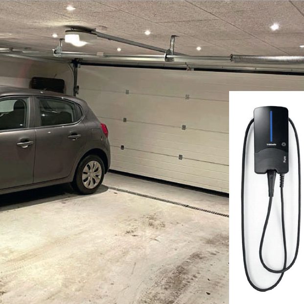 Det er klargjort for hurtiglader. Selv om garasjen foreløpig ikke huser noen elbil, så er den på forhånd blitt utstyrt med nødvendige elektriske installasjoner, slik at en elektriker enkelt kan sette opp en hurtiglader når behovet dukker opp.