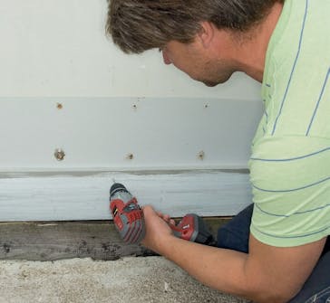 Tynne avstandslister skrus på. De plasseres der de kan få tak i en lekt under frontkledningen. Avstandslistene skal sikre at den nye kledningen ventileres på baksiden. Da holder den lenger.