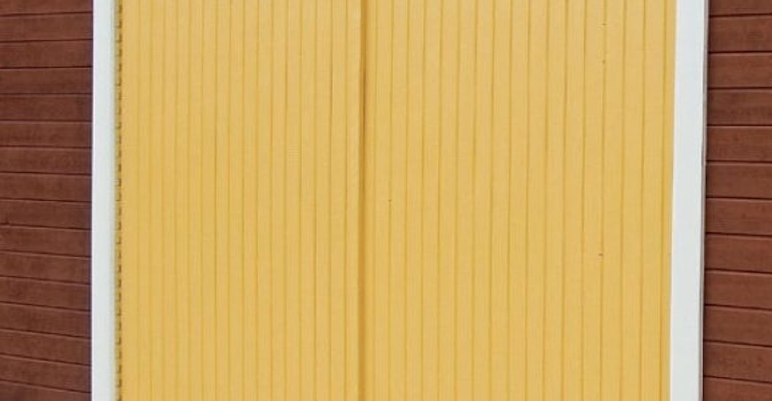 På toppen av selve garasjeporten setter vi pyntelister. Det gir en helt rett kant. Også i midten - i skjøten mellom de to dørene - setter vi en pyntelist. Den skal være gul på det øverste stykket (som panelbordene) og grå på det nederste (som det impregnerte bordet).