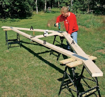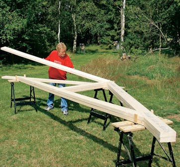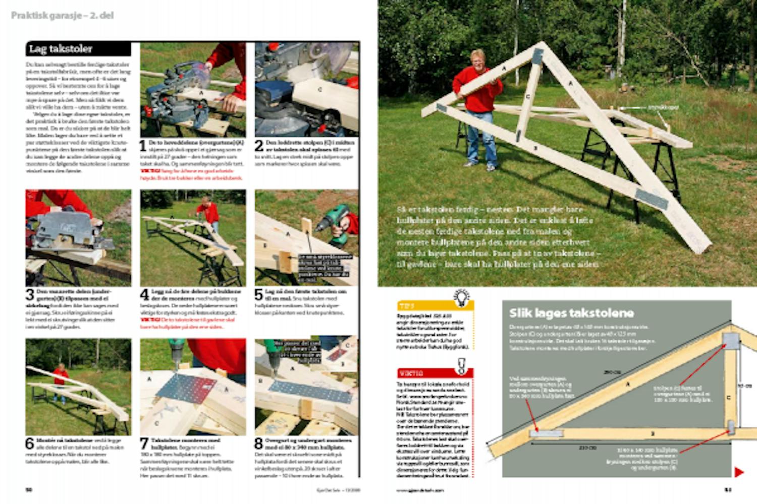 Velger du å lage dine egne takstoler, er det praktisk å bruke den første takstolen som mal. Da er du sikker på at de blir helt like. Malen lager du bare ved å sette et par støtteklosser ved de viktigste knutepunktene på den første takstolen slik at du kan legge de andre delene oppå og montere de følgende takstolene i samme vinkel som den første.