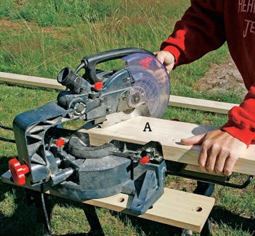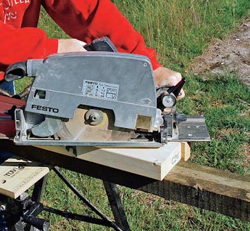 Den vannrette delen (under gurten) (B) tilpasses med ei sirkelsag fordi den ikke kan sages med ei gjærsag. Skru ei føringsskinne på ei lekt med ei skru tvinge slik at den sitter i en vinkel på 27 grader.