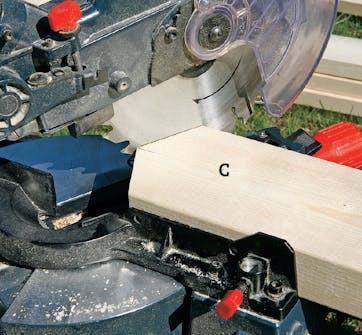 Den loddrette stolpen (C) i midten av takstolen skal spisses til med to snitt. Lag en strek midt på stolpen oppe som markerer hvor spissen skal være.