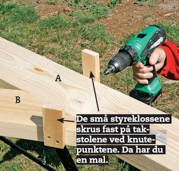 Takstolene festes med kraftige vinkelbeslag som skrus fast i toppsvilla før du løfter opp takstolene. De kan stå festet bare til vinkelbeslagene til du får dem skrudd fast oppe også - til mønelekta. Den skal sitte øverst på takstolene, som har fått kuttet av spissen slik at du har noe å feste kryssfinér platene i. Mål 11,5 cm ned på begge sider av overgurten (A), og forbind de to punktene med en strek. Sag så toppen av takstolen, og det blir akkurat plass til at det kan ligge ei lekt som kryssfinérplatene kan festes i oppe.