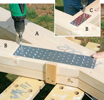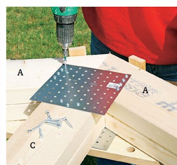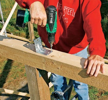 Skru fast et vinkelbeslag på begge toppsvillene slik at du kan feste tak stolen når den løftes opp. Begynn med å merke opp på begge toppsvillene hvor taksstolene skal plasseres, og montér et vinkelbeslag ut for hver oppmerking.