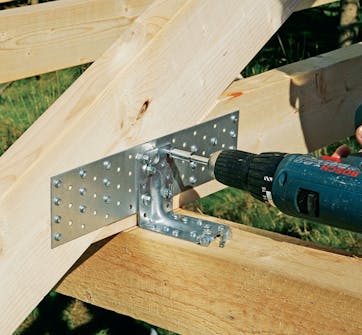 Skru fast vinkelbeslaget på siden av takstolen når den er løftet på plass. Her bruker vi selv skjærende plateskruer, 5,5 x 25 mm som borer seg inn i hullplata.