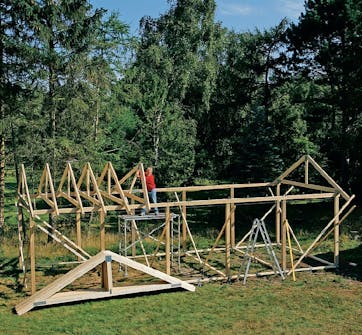 Sett først opp en takstol i hver ende av bygningen. Spenn ut ei snor mellom endene. Da har du snora å rette deg etter når du skal plassere tak stolene imellom.