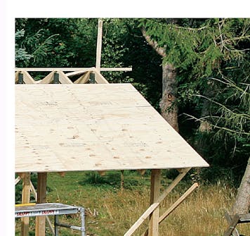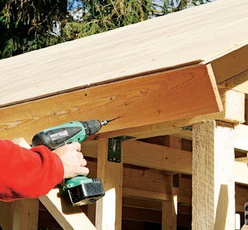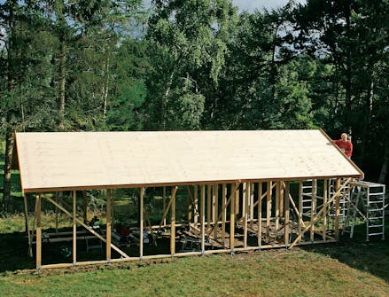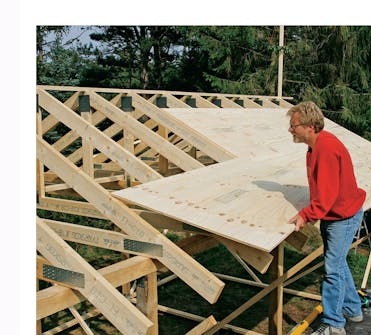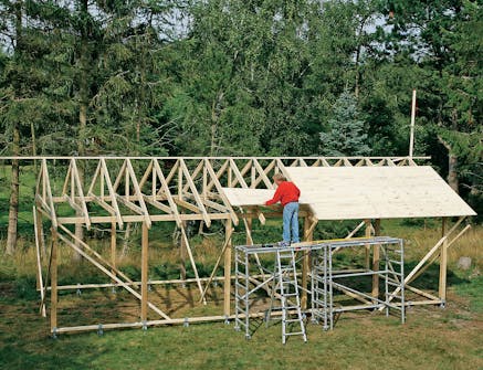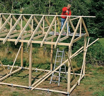 Sett nå en takstol om gangen loddrett, og skru den fast til møne lekta. Når alle takstolene er festet, er du klar til å legge kryssfinérplater på den ene siden av taket. La skrålekta bli sittende til platene er montert på den første siden.