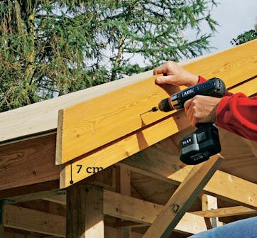 Skru fast et vindskibord utenpå det første. Bordet er 5 cm lengre enn det innerste og løftes 7 cm slik at det blir en kant på taket i gavlen.