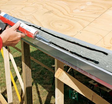 Legg to striper taklim på aluminiumsbeslaget til den første rekka med shingel. Da sikrer du at shingelen kommer til å sitte godt fast. Taklim fås i patroner som er lette å arbeide med.