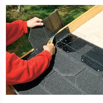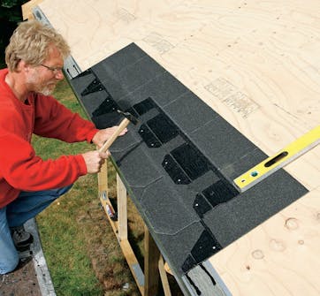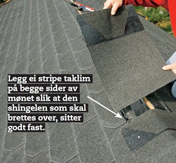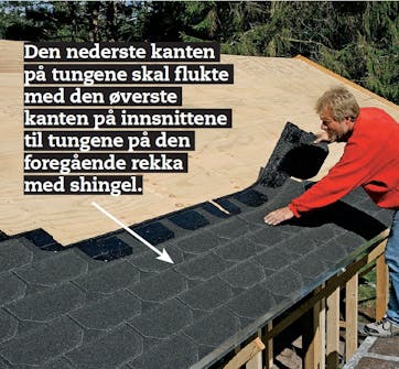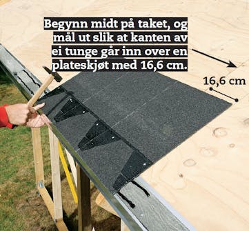 Når du legger shingel, skal du passe på at en shingelskjøt ikke blir liggenede rett over en skjøt i kryssfinérplatene. Mål derfor 16,6 cm - det er målet på ei halv tunge på en shingel - fra en skjøt på kryssfinérplatene slik at du begynner med god avstand til plateskjøtene. Det er en god idé å begynne midt på taket slik at du har litt å gi til begge sider.