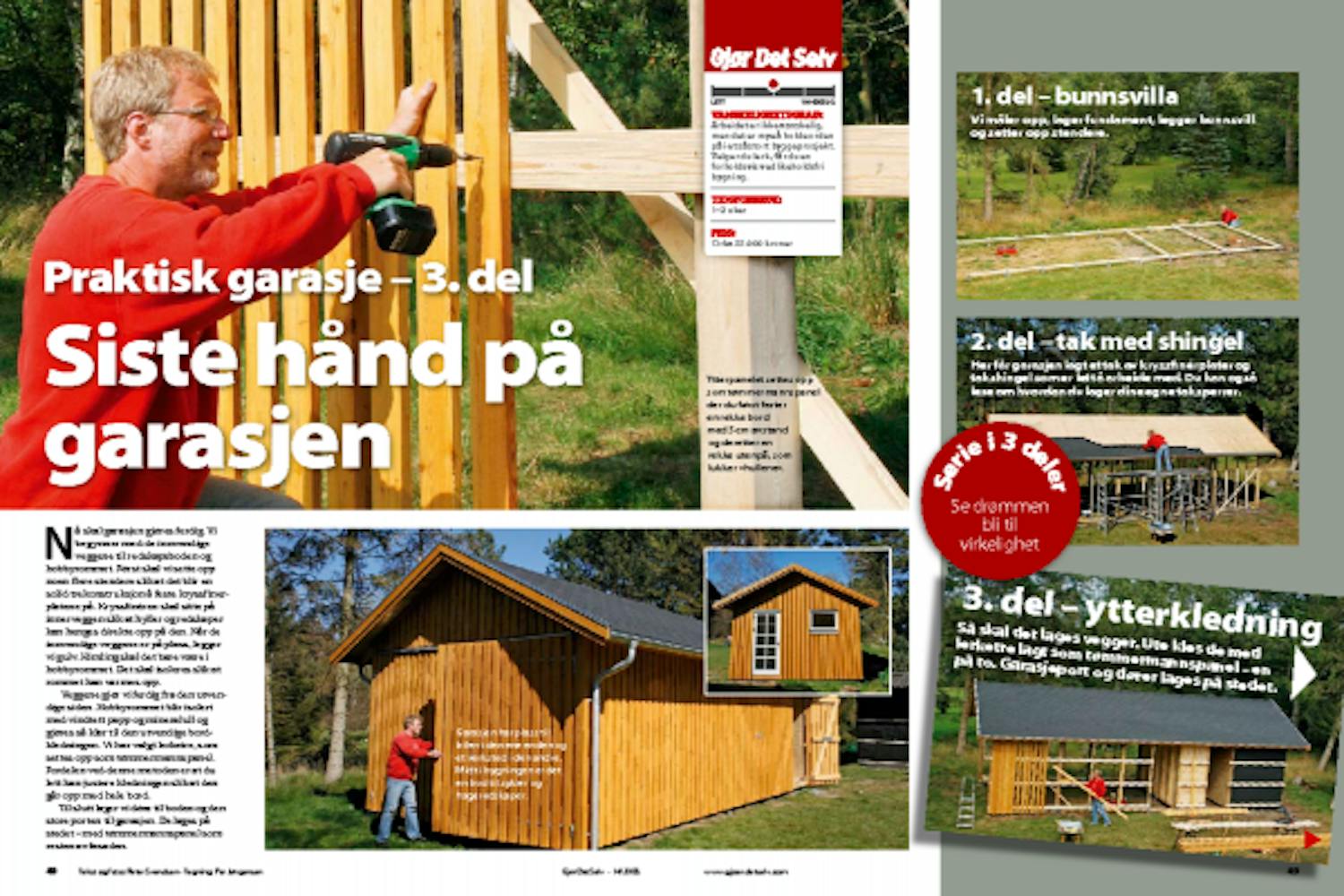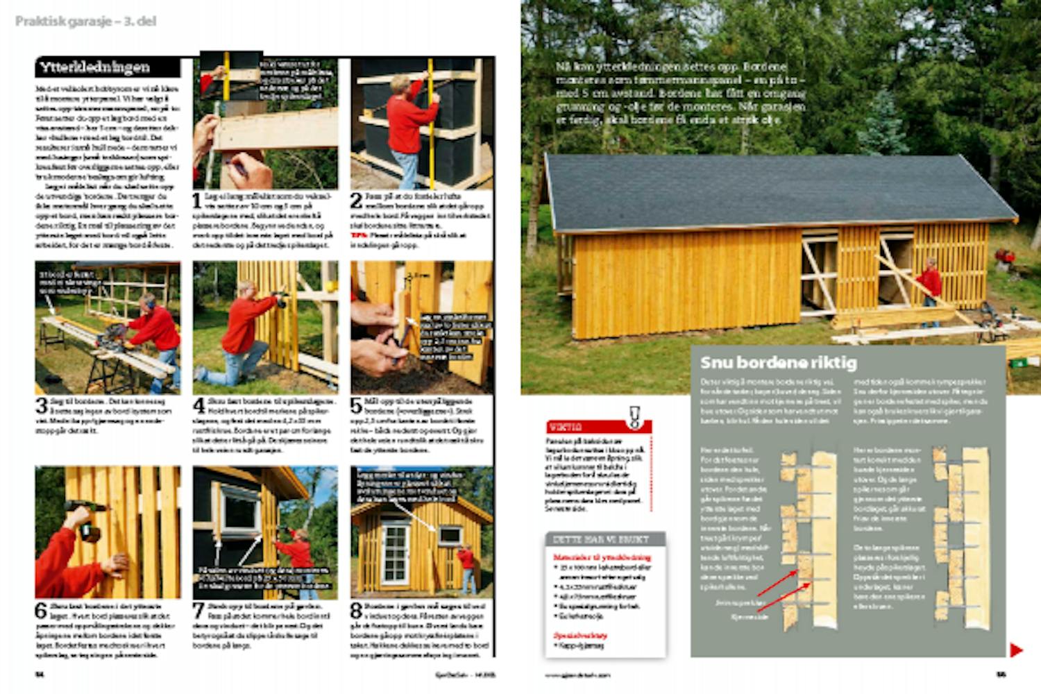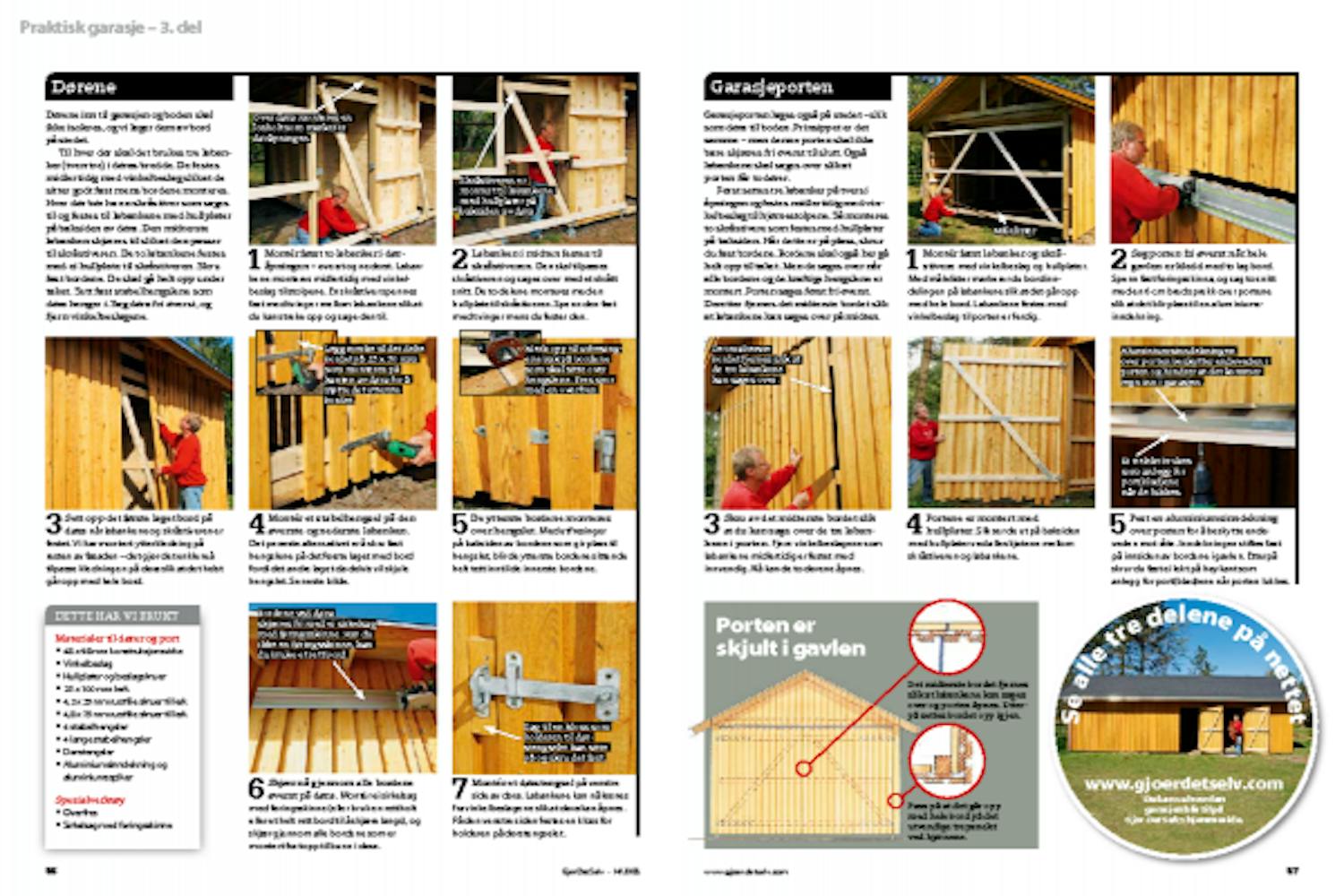 Garasjeporten lages også på stedet - slik som døra til boden. Prinsippet er det samme - men denne porten skal ikke bare skjæres fri øverst til slutt. Også labankene skal sages over slik at porten får to dører.