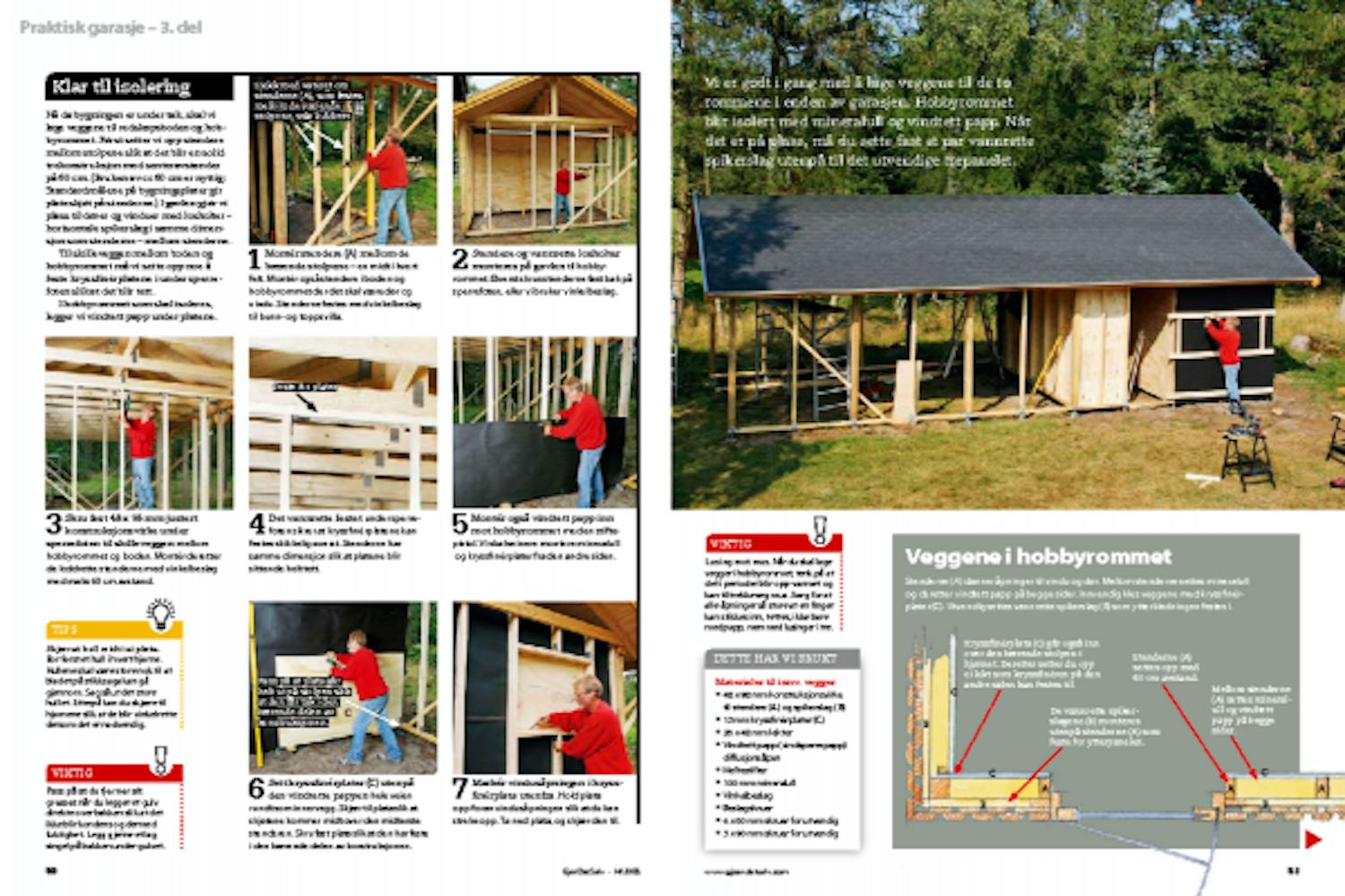 Mineralulla settes i veggene utenfra og deretter kommer enda et lag vindtett papp. Utenpå monteres spikerslag - også rundt dør- og vindusåpninger.