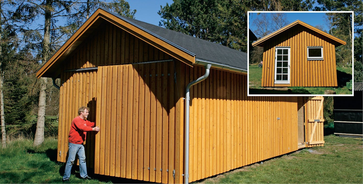 Nå da bygningen er under tak, skal vi lage veggene til redskapsboden og hobbyrommet. Først setter vi opp stendere mellom stolpene slik at det blir en solid trekonstruksjon med senteravstander på 60 cm. (Bruken av cc 60 cm er nyttig: Standardmålene på bygningsplater gir plateskjøt på stenderne.) I gavlen gjør vi plass til dører og vinduer med losholter - horisontale spikerslag i samme dimensjon som stenderne - mellom stenderne.