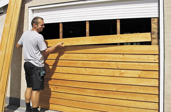 Dersom ramma er i orden, er det lett å skifte bordene i denne typen garasjeport.
