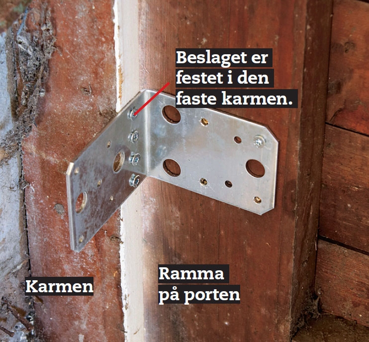 En vinkel på hver side av den innvendige ramma sikrer at den forblir i vinkel og ikke flytter seg når vi tar vekk noe av vekta av porten. Vippebeslagene lar vi sitte på.