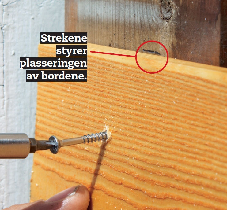 Det første bordet settes på slik at det sitter rett på ramma. Er underlaget skjevt, må du sage det til slik at det flukter med underlaget.