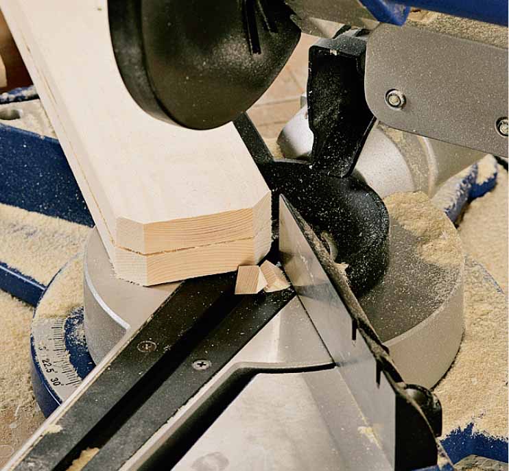 Skarpe hjørner bør rundes eller når kappsaga stilles på 45 grader, og stoppeklossen føres fram, slik at hjørnene kappes med én centimeter.