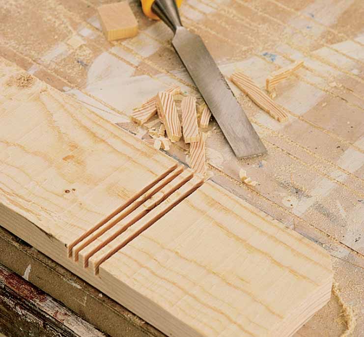 De ferdigsagde sporene gjør det lett å gjøre ferdig utsparingene med et stemjern. Fjern treet mellom sporene, og rens opp i bunnen av utsparingene.