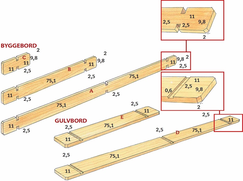 Bordene skal sages i tre lengder, og «hakk» (utsparinger) og spor skal skjæres i nøyaktig avstand og dybde.