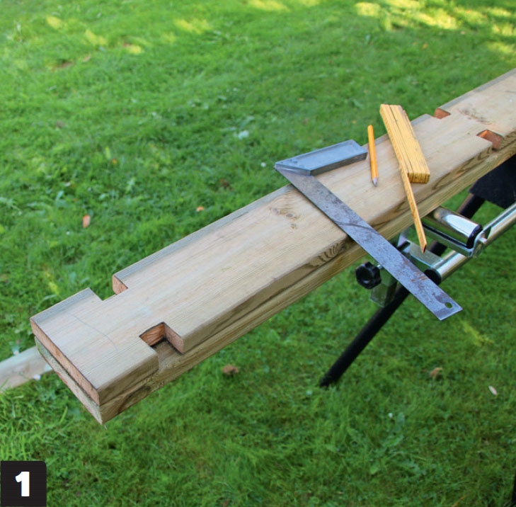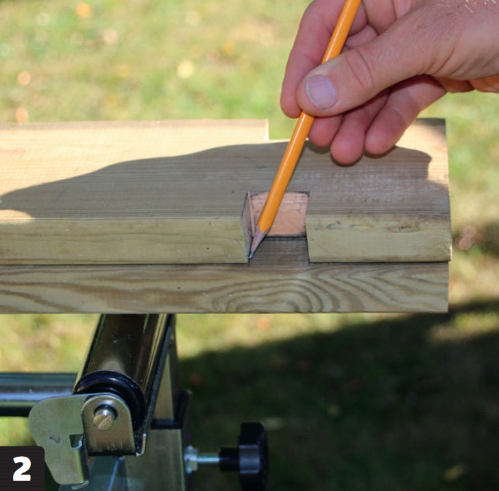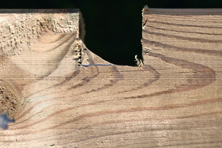 Husk at hakkene på malen skal være en anelse større, fordi du tegner streken innvendig i hakkene. Hvis du blir i tvil om du skal sage innenfor eller utenfor streken, så sag utenfor. Det gjør ingenting hvis hakkene blir litt for store. Men hvis de passer “for godt”, blir lekehuset vanskeligere å sette sammen.