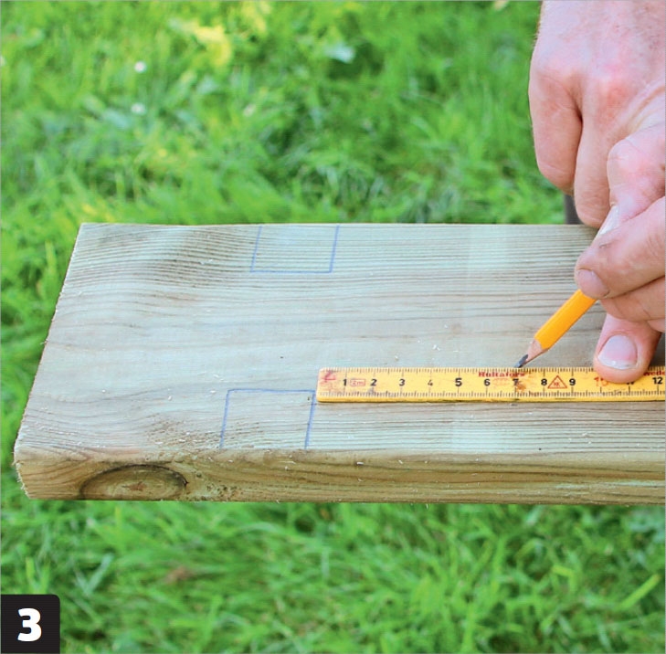 Legg malen oppå et nytt bord. Merk først opp lengden, og tegn deretter det antallet hakk du skal bruke: Åtte til en firermodul, seks til en treermodul, fire til en toermodul og to til en enermodul.