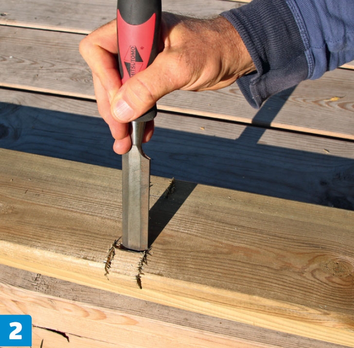Stem av klossen med et skarpt stemjern. Snu stemjernet som vist for å få kanten så rett og skarp som mulig. Legg bordet på et underlag som ikke svikter, og som kan tåle noen harde slag.