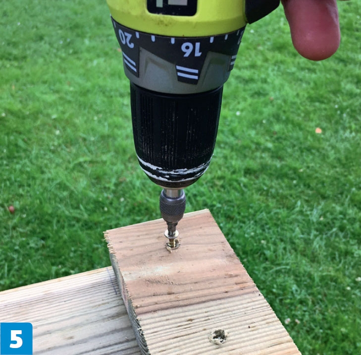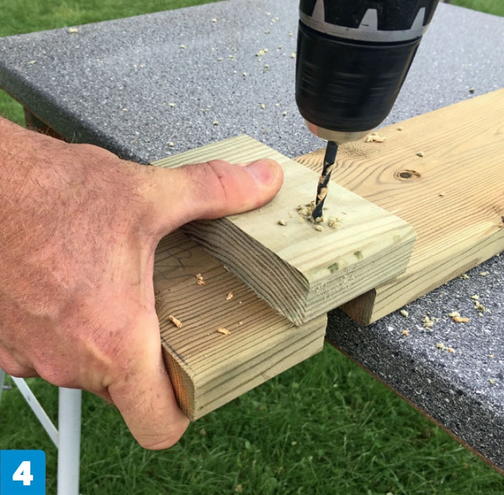 Vi forborer til to hull i hver kloss. Vi bruker malen som underlag, fordi de to hakkene i den passer perfekt. Du kan også bare bore ned i et restestykke.