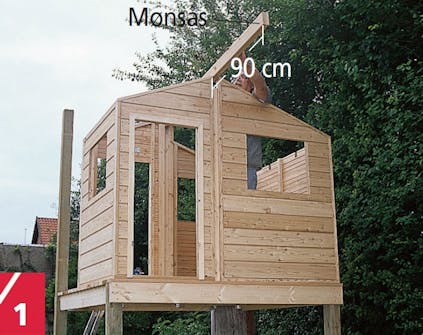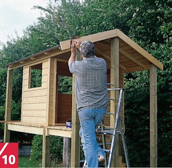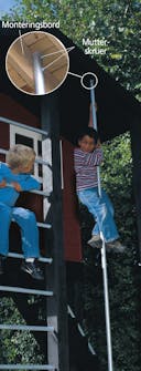 For sikkerhets skyld er trappa også utstyrt med gelender - et stykke av et galvanisert vannrør som festes til veggen på lekehuset og stolpen på plattforma med skruklammer. Gelenderet monterer du 70 cm over trappa, og de skarpe kantene lukkes med passende propper slik at de ikke kan skade noen.
