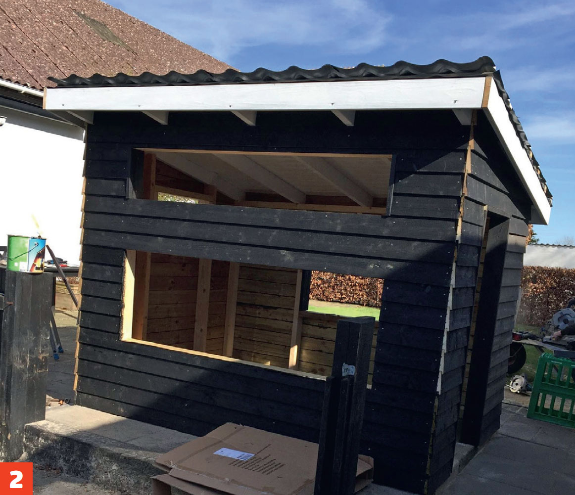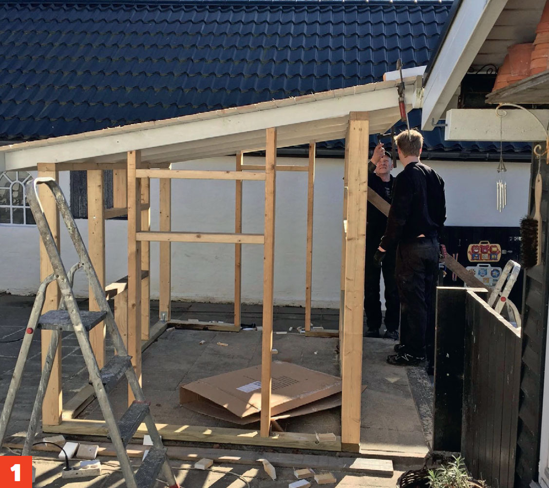 Bygget som en vanlig utebod. Stenderverket er laget av 98 x 48 mm, takkonstruksjonen av det samme, mens undertaket er av OSB-plater.