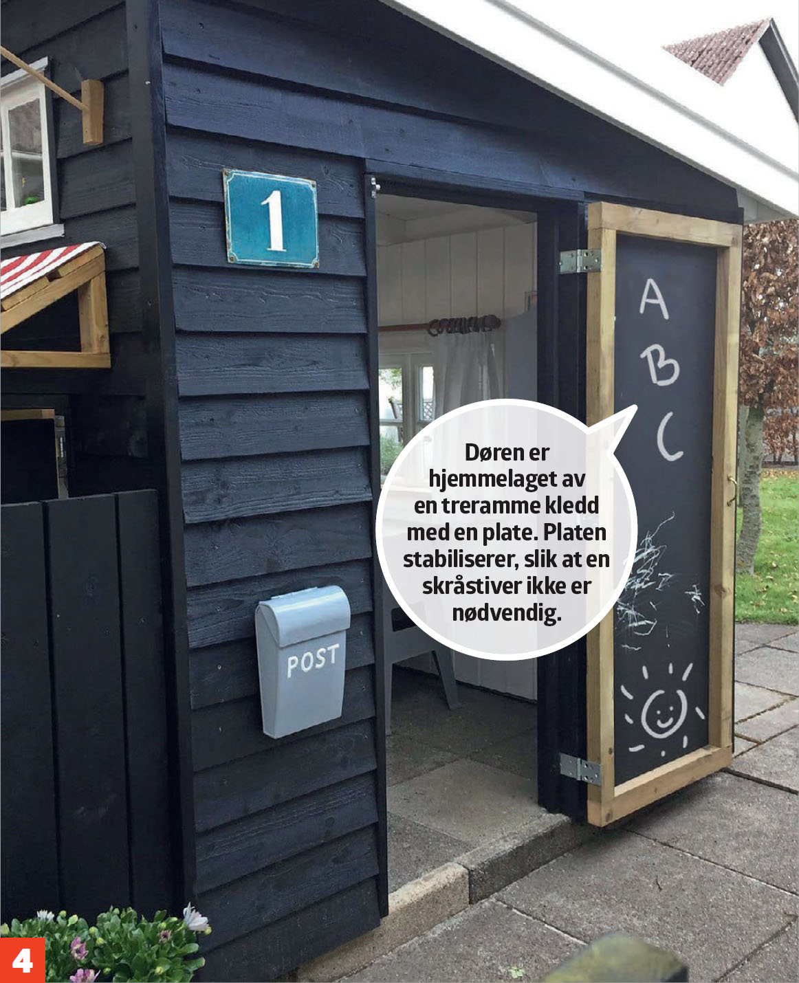 Lekehuset er hevet over bakken. Selv om lekehuset står ute, skal det kunne holdes rent. Derfor er det hevet en betonghelles tykkelse over bakken, slik at skitt kan feies ut.